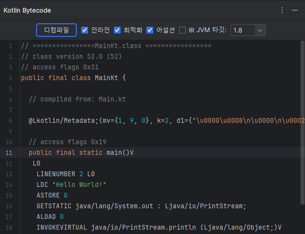 Tools>Kotlin>Show Kotlin Bytecode → Decompile 버튼으로 확인가능 합니다.