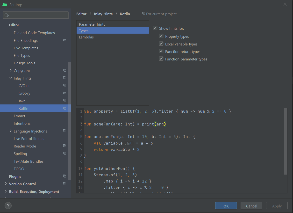 코틀린을 이제 막 공부하는 입장에서, 변수타입이 생략되는 것이 편하기도 합니다. 하지만, 어떤 타입인지 명확히 알고 싶을 때 Hint옵션을 On 해준다면 좀 더 정확하게 이해하면서 배울 수 있을 것 같네요~