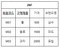 - 회원코드 → 구매 제품, 구매제품 → 브랜드 이므로 이행적 함수 종속성을 가지고 있다고 판단할 수 있습니다.