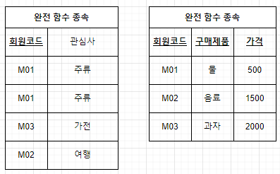 - 예) 완전 함수 종속 : 회원 코드로 인해서 회원명, 관심사, 거주지가 모두 결정됩니다.