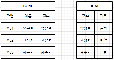 - 하지만, 실제로는 교수에 따라 과목이 결정되므로, 아래와 같은 테이블로 나눌 수 있습니다.