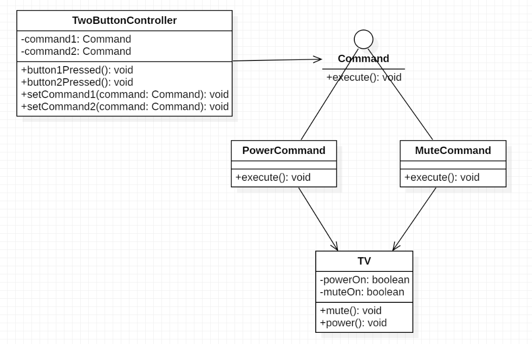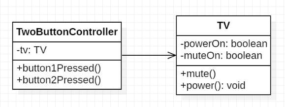 button1, 2에서 실행시키고자 하는 기능이 변경되거나 추가될 경우 TwoButtonController를 직접 수정해야한다. 예를 들어, TV가 아닌 스피커로 변경이 된다면, TwoButtonController 내부에 tv 대신 스피커 객체로 바꿔주고, button pressed에 따른 동작도 수정해주어야 하므로, Open Close Principle에 위배된다.