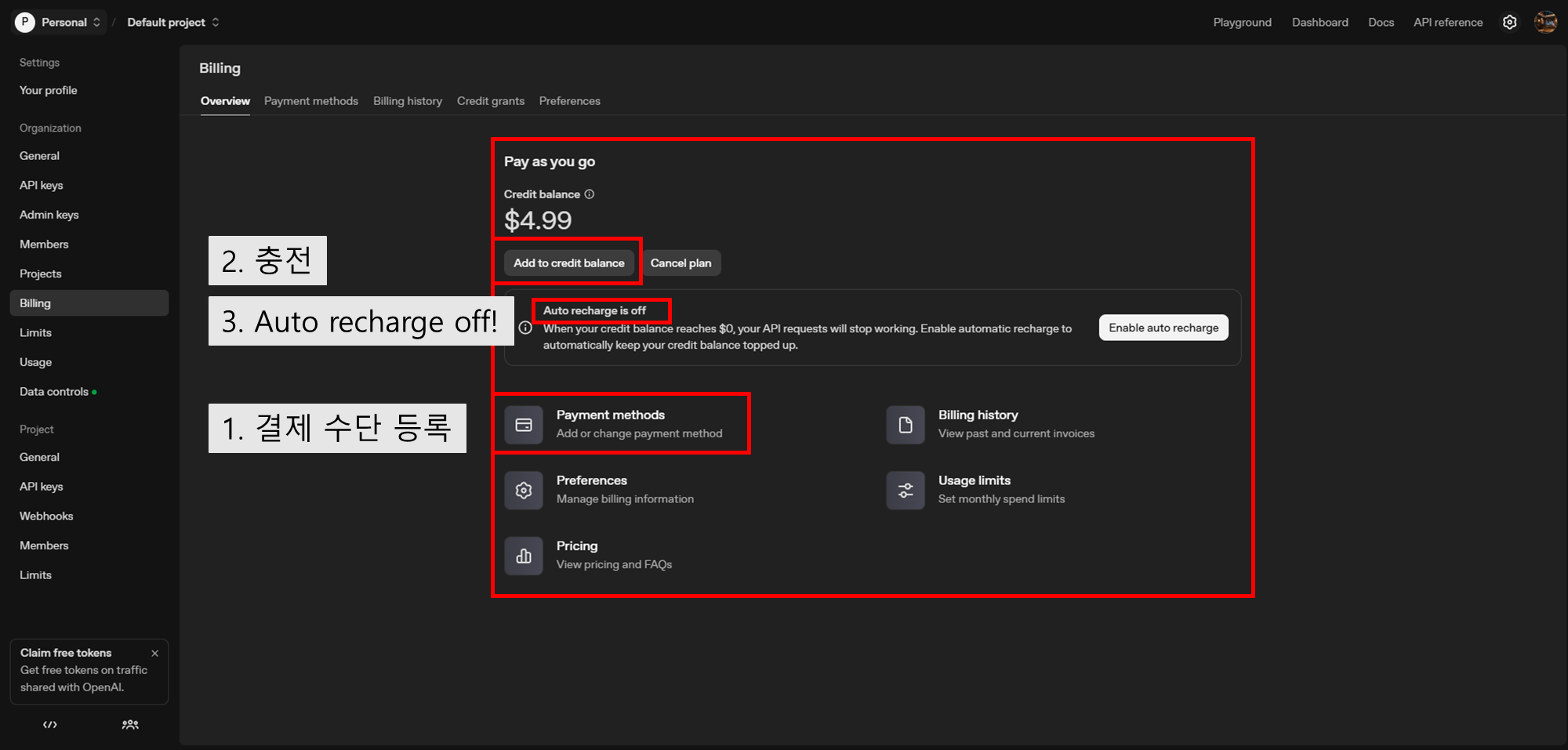 3. Billing 결제수단 등록 및 5달러 충전(최소금액)