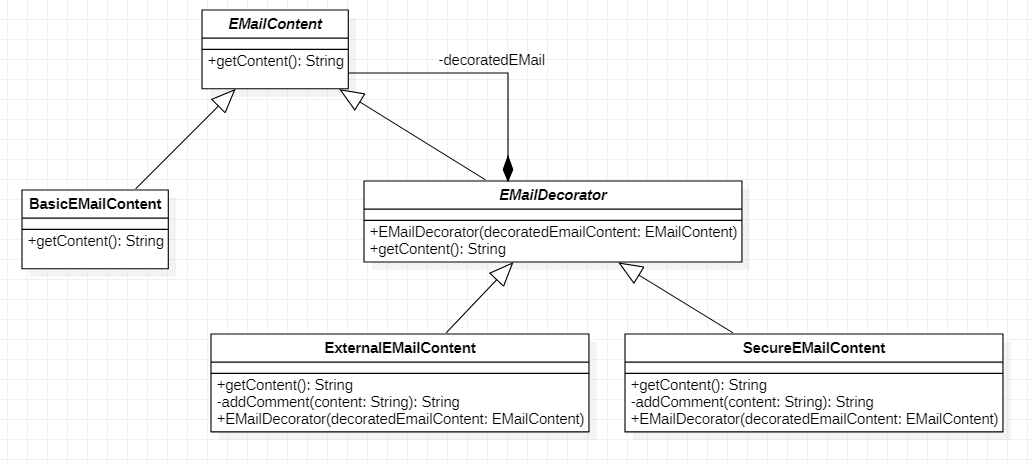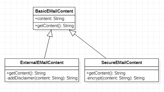 - ConcreteDecorator : ExternalEMailContent, SecureEMailContent