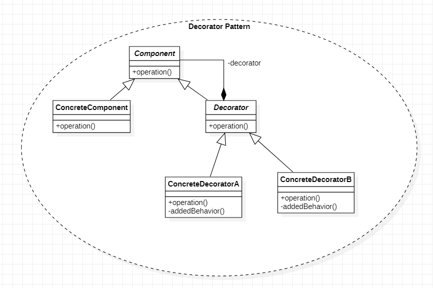 - Component : 기본 기능을 뜻하는 ConcreteComponent와 추가 기능을 뜻하는 Decorator의 공통 기능을 정의한다. 즉, 클라이언트는 Component를 통해 실제 객체를 사용한다.