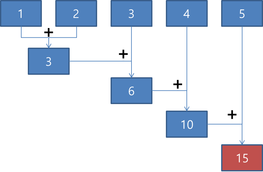 스트림 요소를 줄여나가면서 연산 수행 및 최종결과 반환. 그래서 매개변수 타입이 BinaryOperator<T>!이다. 처음 두 요소로 연산한 결과를 가지고 다음 요소와 연산을 진행한다.