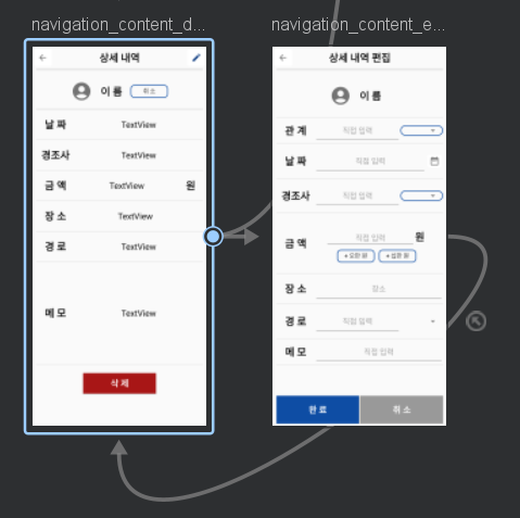 상세내역 화면 → 편집 → (편집완료) → 상세내역 화면(편집된 내용으로)