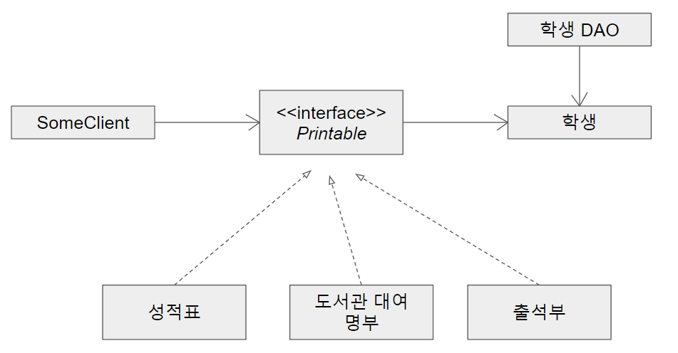 SRP(단일 책임 원칙)를 만족하더라도 ISP를 반드시 만족한다고는 할 수 없다. 책에서는 게시판을 예시로 들었다. 글쓰기, 읽기, 수정, 삭제를 위한 메서드가 제공되지만, 클라이언트에 따라서 일부의 기능만 사용할 수 있다. 관리자만 게시판을 삭제할 수 있는 경우! 이 경우 게시판 클래스는 SRP를 만족한다. 하지만, 이 클래스의 모든 메서드가 들어있는 인터페이스가 클라이언트에 상관없이 사용된다면 ISP에 위반된다.