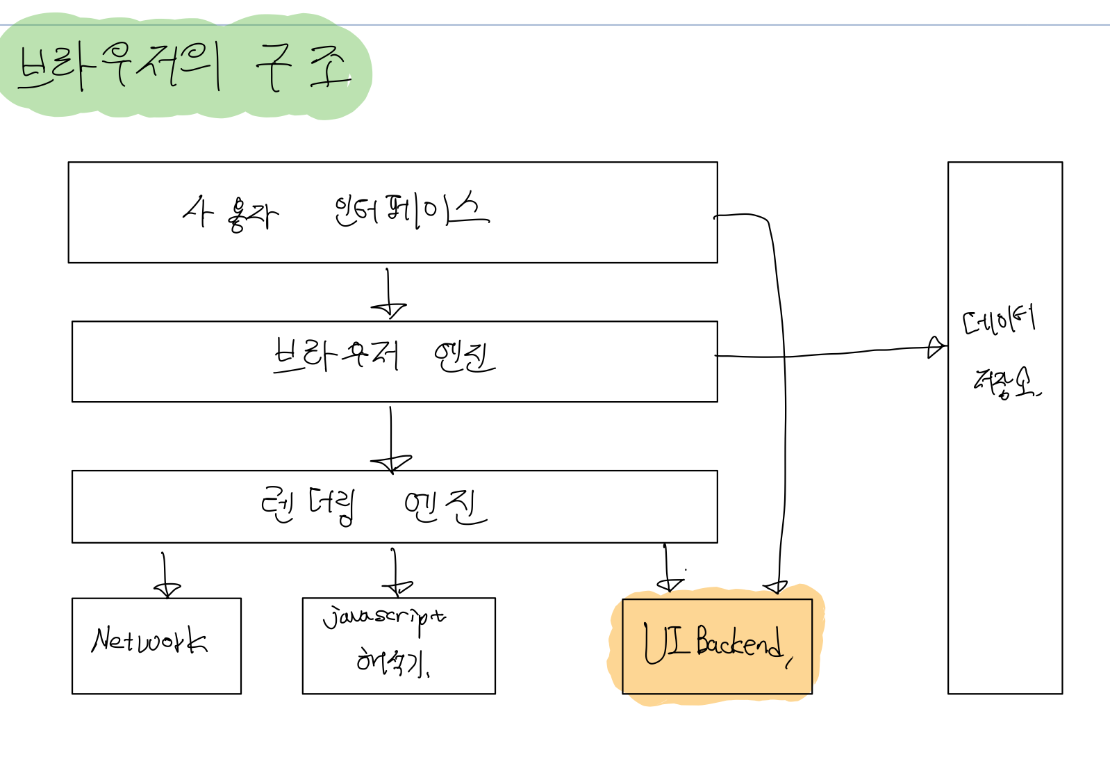 ● 사용자 인터페이스, 네트워크 모듈, 렌더링 엔진, 브라우저 엔진, 자바스크립트엔진(해석기), UI 백엔드, 데이터 저장소