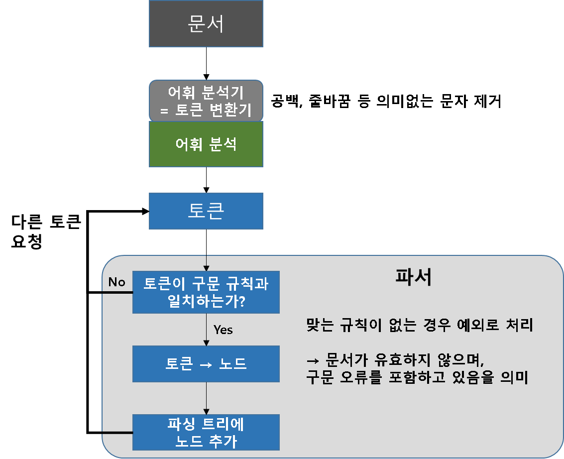파싱 과정은 아래와 같이 이루어지며, 문서를 모두 읽고 파싱 트리 완성 또는 예외 처리하기 전까지 반복된다.