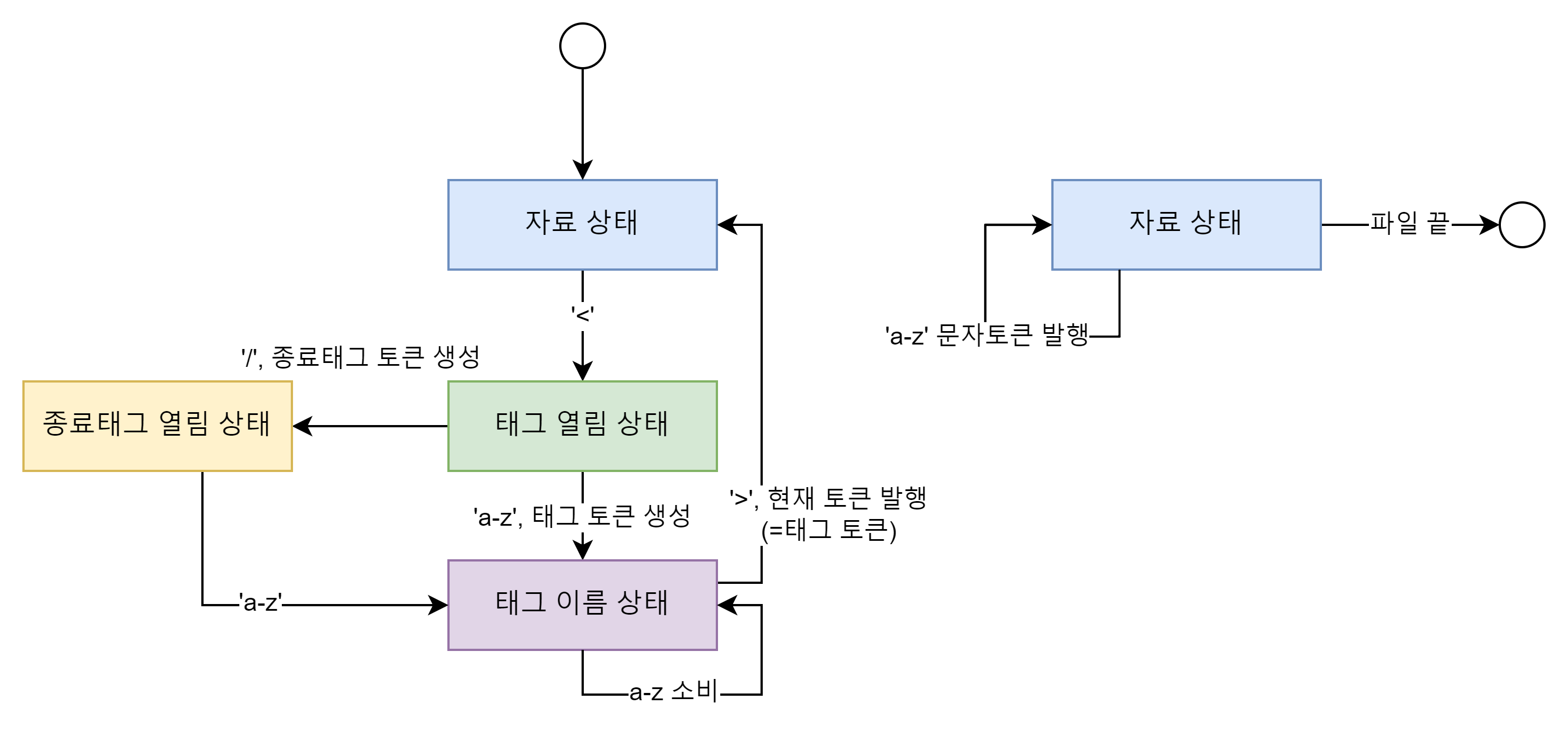 2. 태그 열림 상태 : 'a-z'를 만나면 태그 토큰을 생성, '/'을 만나면 종료 태그 토큰을 생성한다.