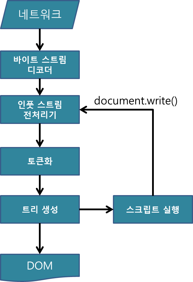 △ 변경에 의한 재파싱. 스크립트의 document.write는 토큰을 추가할 수 있기 때문에, 입력 과정에서 파싱이 수정될 수 있따.