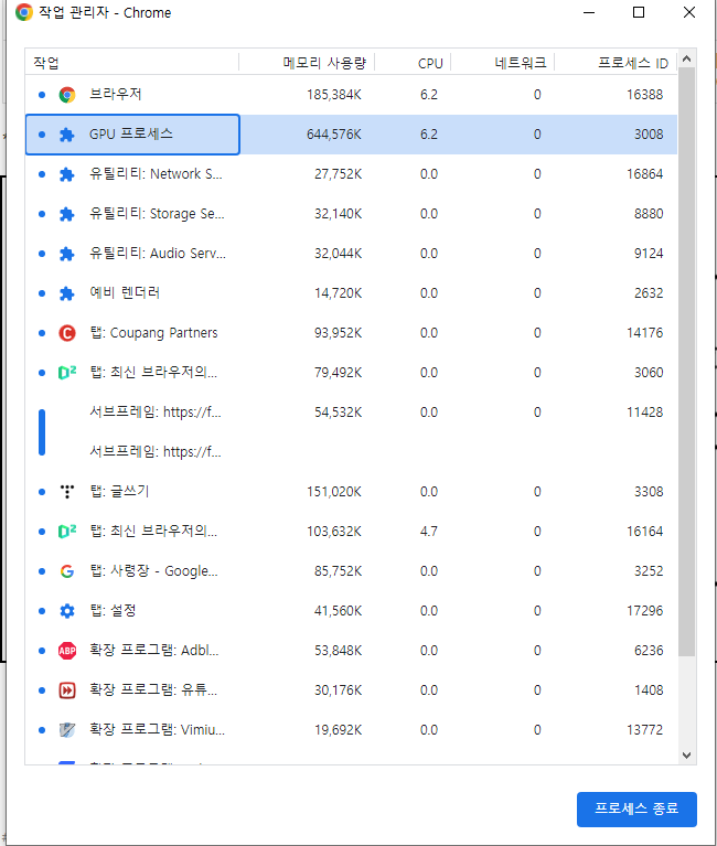-> 크롬> 크롬 맞춤설정 및 제어 버튼> 도구 더보기> 작업 관리자