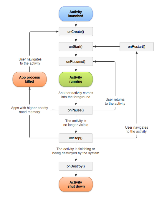 실행 시점을 파악하기 전에 액티비티의 라이프 사이클은 다음과 같다.