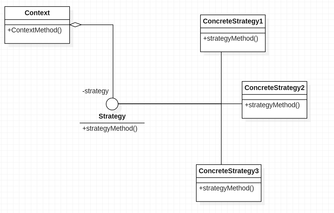 - Context : 스트래티지 패턴을 이용하는 역할 수행. 필요에 따라 구체적인 전략을 바꿀 수 있도록 setter 메서드 제공.