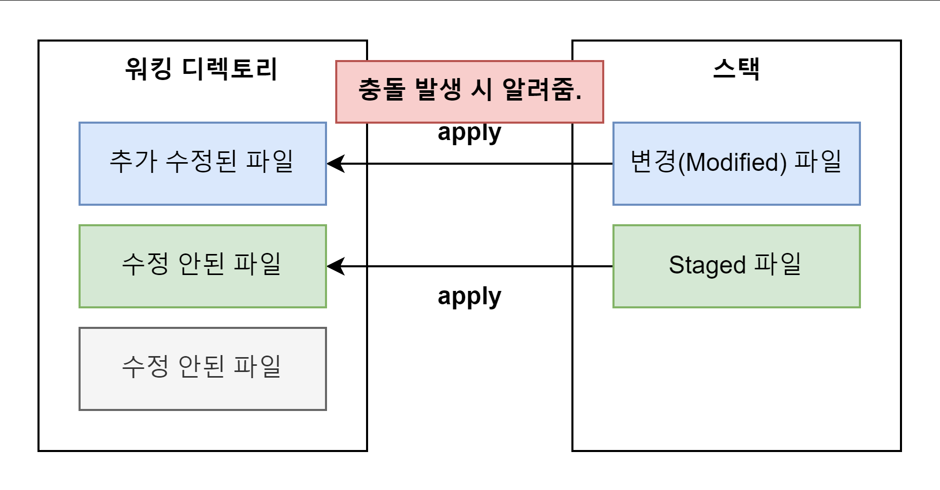 이 때, 워킹 디렉토리의 변경사항, staged 파일은 모두 stash 스택으로 이동하며, 워킹 디렉토리는 깨끗해진다.