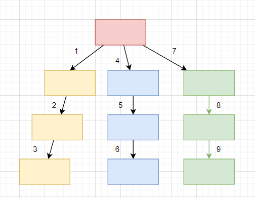 아래와 같이 노란색을 전부 살펴본 후, 파란색을 탐색한다는 것이다.