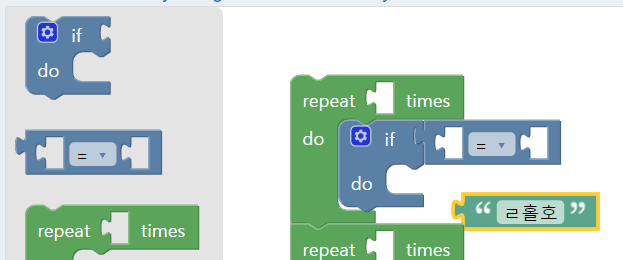 각 블록은 미리 프로그램된 내용이 들어가 있어, 이를 끌어다 놓아서 프로그램을 만들 수 있습니다.
